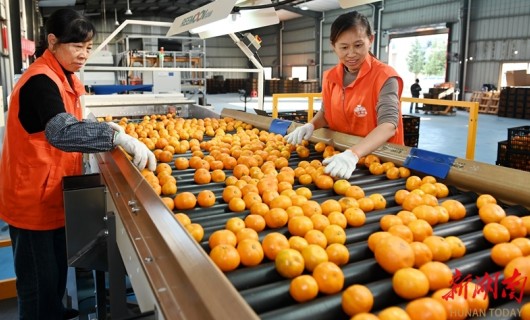 최근 둥커우현 화구가도에 위치한 칠령과업유한공사의 스마트 선과 작업장에서, 작업자들이 감귤을 분류하고 있다.