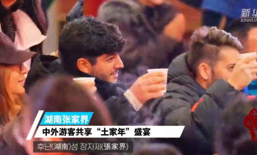 화려하게 장식된 후난(湖南)성 장자제(張家界) 첸구칭(千古情) 관광지. 약 500명의 국내외 관광객이 투자(土家)족과 한자리에 모여 무형문화유산 민속 공연을 함께 감상하고 춘절(春節·음력설)을 기념하며 색다른 '...