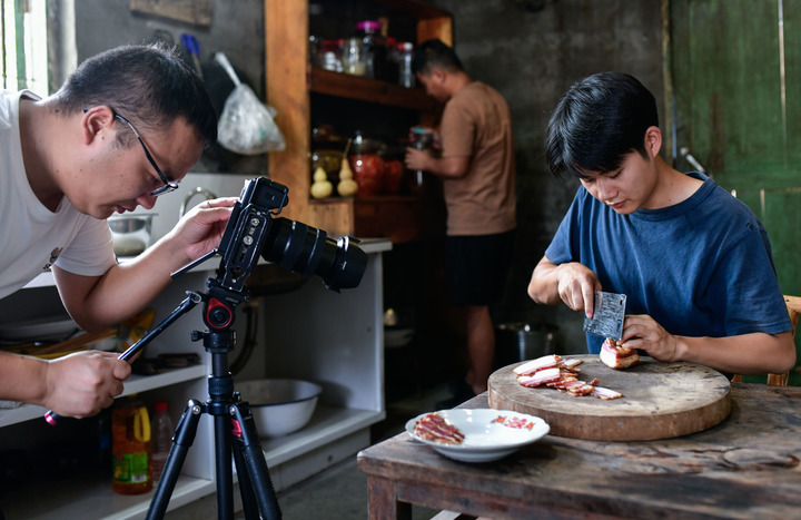 한 영상 제작팀이 구이저우(貴州)성 퉁런(銅仁)시 천자자이(陳家寨)촌에서 숏폼을 촬영하고 있다. (사진/신화통신)