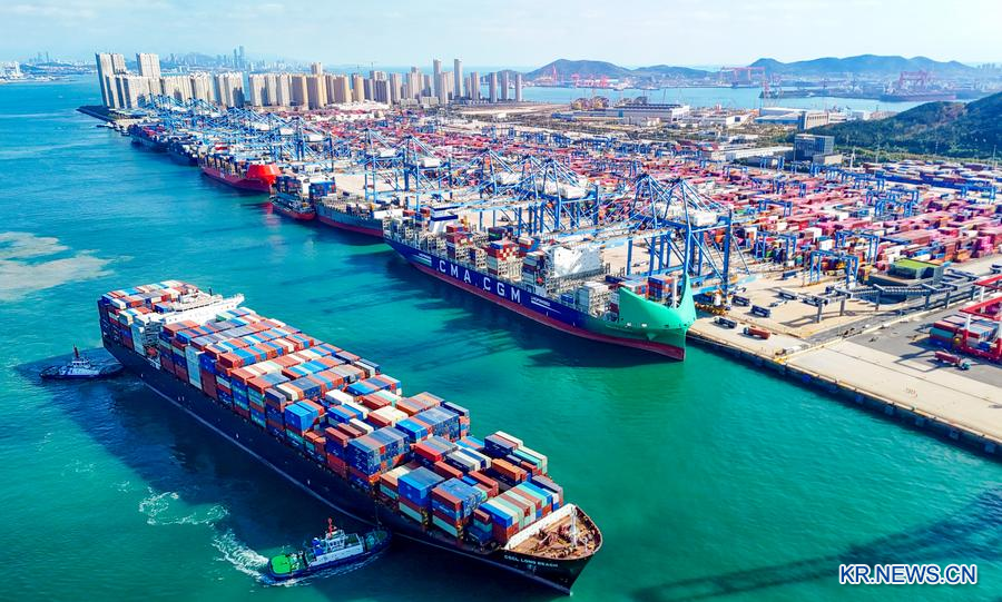 지난 11월 5일 화물을 가득 싣고 산둥(山東)성 칭다오(青島)자유무역구역에서 출항하는 화물선을 드론으로 내려다봤다. (자료사진/신화통신)