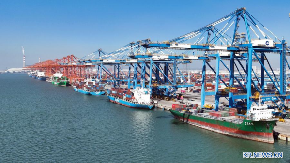 지난 11월 29일 광시(廣西)좡족자치구 친저우(欽州)항 부두에서 컨테이너를 하역 중인 화물선을 드론에 담았다. (사진/신화통신)