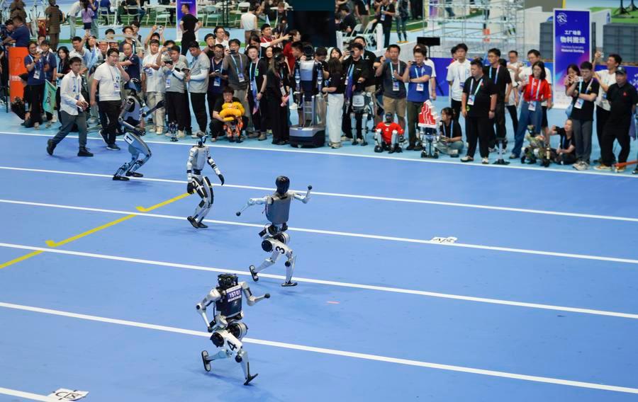 지난 8월 14일 '2025 세계 휴머노이드 로봇 운동회' 개막식에서 로봇이 100m 달리기를 하고 있다. (사진/신화통신)