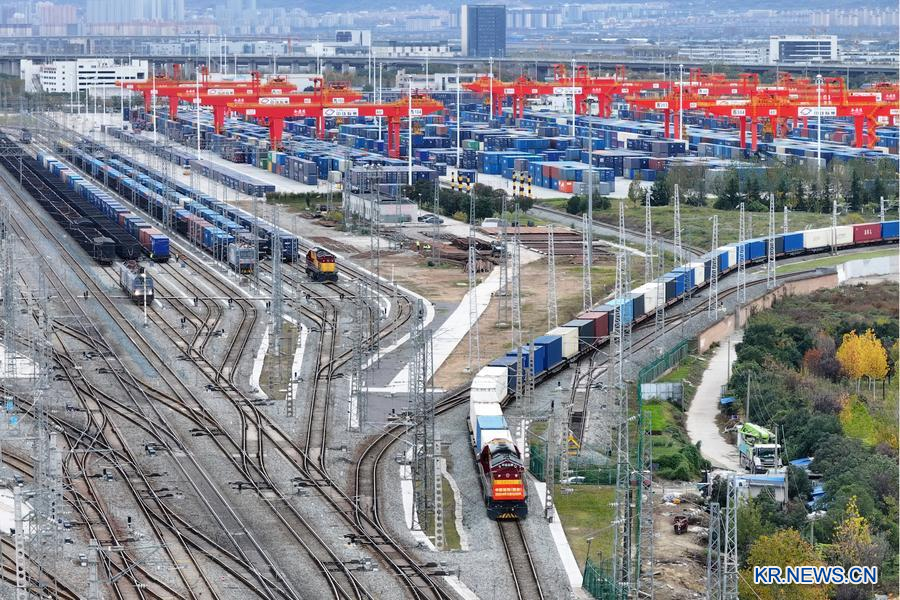 2025년 11월 17일 시안(西安) 국제항역을 출발해 아제르바이잔 바쿠로 향하는 중국-유럽 화물열차(시안)를 드론으로 담았다. (사진/신화통신)
