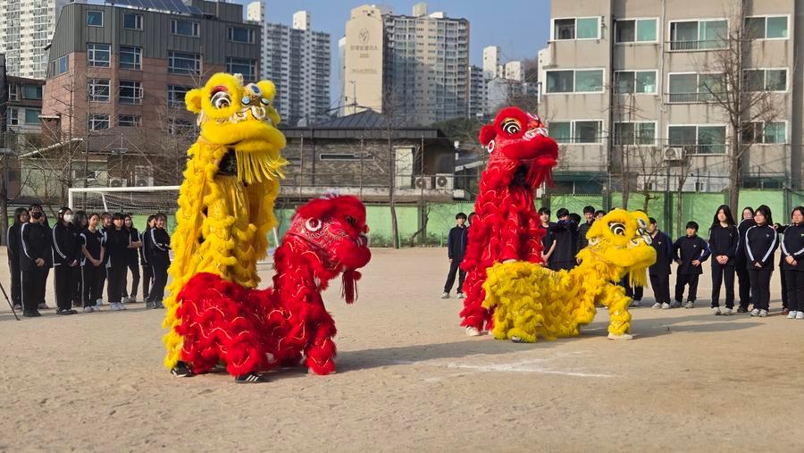 27일 열린 한국산둥(山東)상회의 한성화교중학(한국한성화교중고등학교) 사자춤 도구 기증식에서 공연을 펼치는 학생 사자춤 팀. (사진/신화통신)