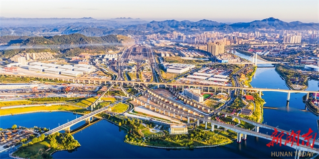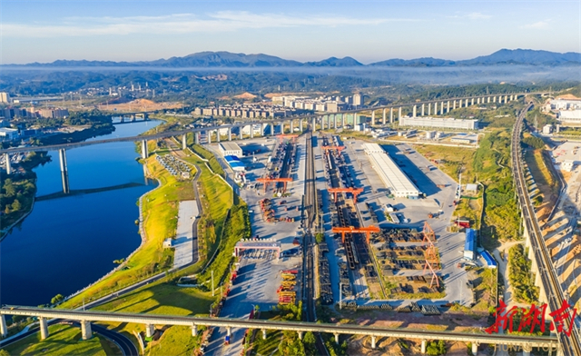 10월 7일, 상공에서 내려다본 화이화 국제육상항만 화물장은 분주한 모습을 보였다. 화이화는 서부육해신통로 ‘13+2’ 성간 협의 협력 메커니즘의 회원으로, 후난성에서 유일하게 아세안(ASEAN)을 향한 화물 집산 중심지이다. 현재 화이화 국제육상항만은 베이부완(北部湾) 철도-해운 연계 운송 노선과 중국-라오스, 중국-베트남 등 7개의 국제 물류 대통로를 개척했다. 사진 톈원궈(田文国)