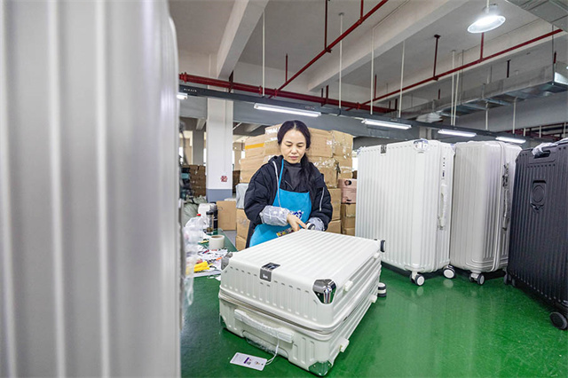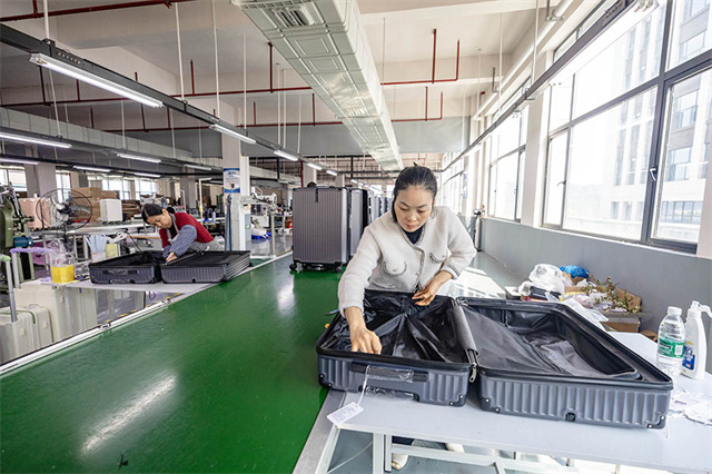 10월 23일, 지서우 경제개발구의 가방·의류 산업단지에서 푸미(福米) 가방유한회사 직원들이 여행용 캐리어 제작에 한창이다.