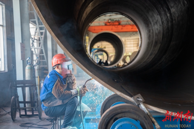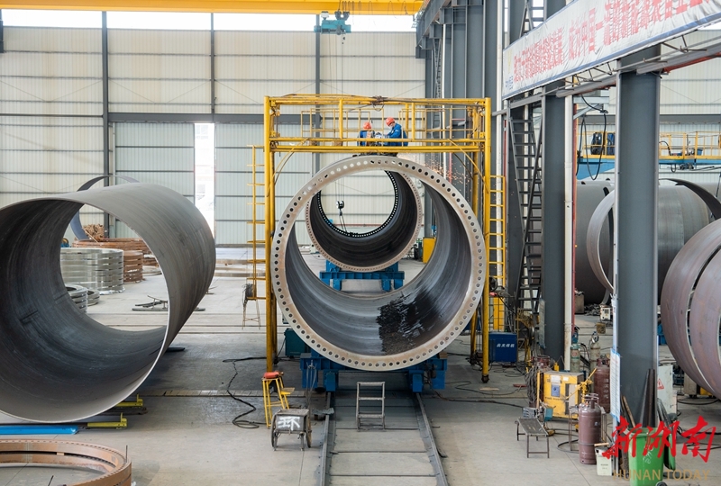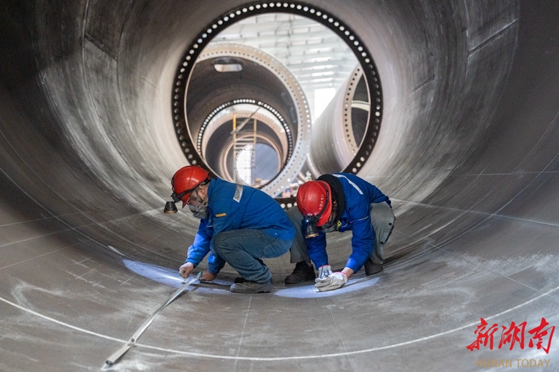 최근, 헝산 고신구(하이테크존)에 위치한 후난 헝위에 중강강구조공정유한공사에서, 노동자들이 스마트 검사 장비를 사용해 풍력발전기 대형 부품의 평면도를 검사했다.