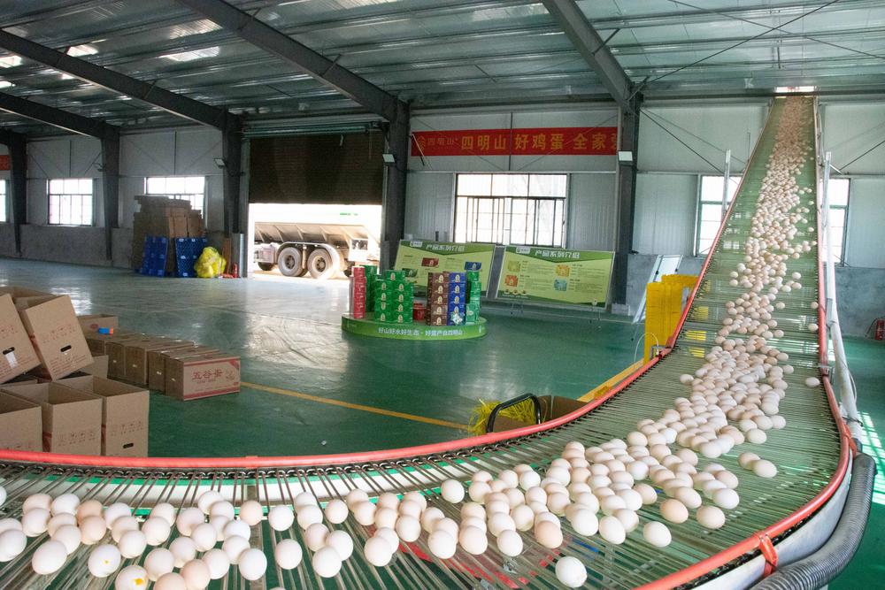 28일 후난(湖南)성 융저우(永州)시 렁수이탄(冷水灘)구 마이쯔위안(麥子園)촌의 한 양계장에서 계란 운송 컨베이어 벨트가 작동하고 있다.