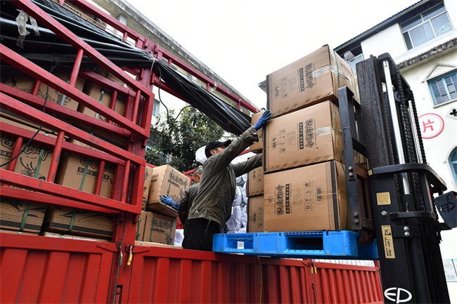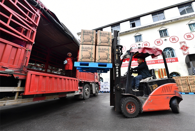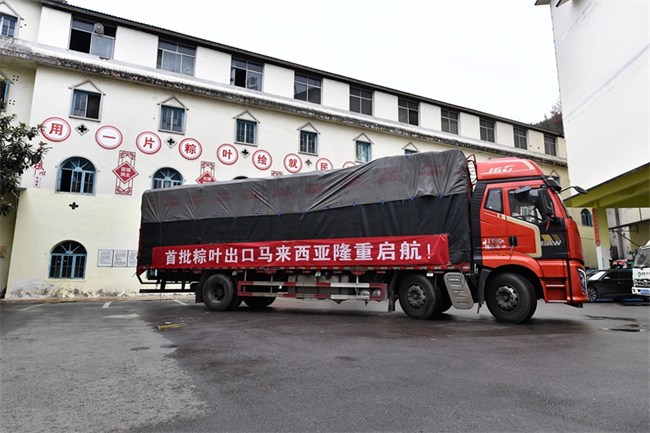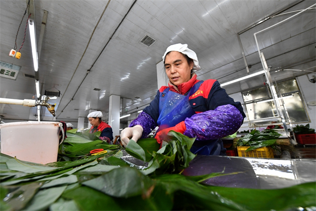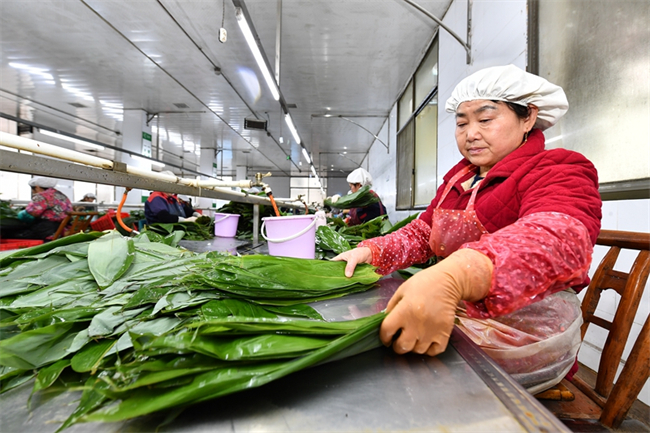 12월 4일, 장자제 강화실업 주식회사에서 근로자들이 쯔웅예(종잎, 粽叶)를 가공하고 있다. 이날 회사의 50톤 고품질 쯔웅예는 물류를 통해 말레이시아로 발송될 예정이다. 이는 올해 7월 기업이 2025 말레이시아 국제 식품 음료 전시회에서 총 주문량이 200톤에 달하는 주문을 받은 후의 첫 수출이다. 이 회사는 국가급 농업 산업화 주요 선도 기업으로서 상지현에 만 묘(万亩) 생태 쯔웅예 재배 기지를 설립하고, 통일된 기술 지도와 최저 가격 보장 수매를 통해 수천 명의 산간 지역 농가 소득 증대를 이끌고 있다. 사진: 셰잉 (邵颖)