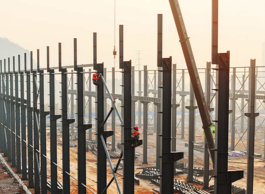 12월 18일, 자허 고신기술산업개발구에서 노동자들이 철골 구조 표준 공장 건물 시공을 진행하고 있다. 최근 몇 년간 이 현은 단조·주조 산업의 우위를 기반으로 경영 환경을 더욱 최적화하고 산업단지 프로젝트 건설을 추진하여, 산업 사슬의 고도화 전환과 질적 향상·효율 증대를 효과적으로 이끌며, 현(縣) 단위 공업 경제의 고품질 발전을 뒷받침하고 있다. 사진: 황춘타오