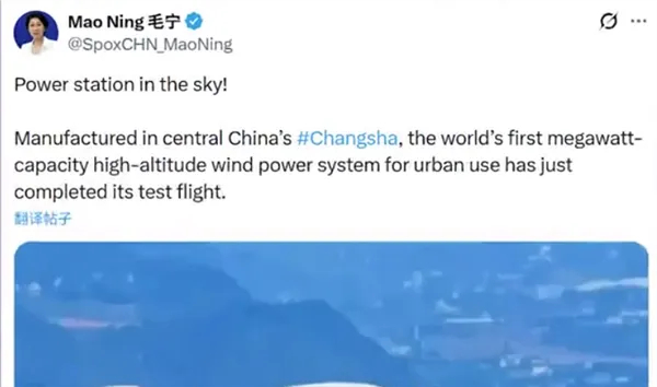 외교부 대변인 마오닝은 최근 세계에 중국의 공중풍력발전 시스템을 소개했다. 이 발전 시스템은 후난성 샹장 신구(湘江新区)의 기업인 린이윈촨 에너지 테크놀로지 유한회사(临一云川能源技术有限公司)가 자체적으로 연구 개발했으며, 웨양 경제기술개발구(岳阳经开区)에서 생산과 최종 조립을 완료했다. 길이 60m, 너비 40m, 높이 40m 로 '비행선' 형태를 띠고 있다.