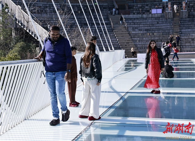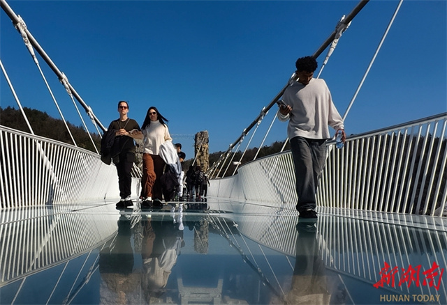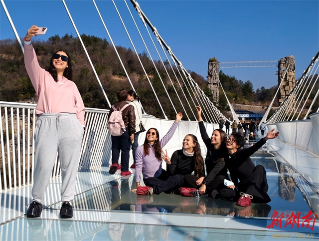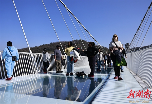 최근 외국 관광객들이 장자제 대협곡 관광지의 고공 유리다리에서 관광을 즐기고 있었다. 새해가 시작되면서 무비자 정책의 편리함과 영화 《아바타》의 실제 촬영지로 알려진 독특한 매력을 바탕으로 장자제시의 입국 관광 시장 열기가 지속적으로 상승했으며, 외국 관광객들이 중국을 여행할 때 선호하는 인기 목적지로 부상했다. 사진: 우융빙(吴勇兵)