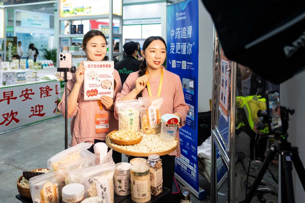(중국 창사=신화통신) 10일 후난(湖南)성 창사(長沙)시에 위치한 후난국제컨벤션센터에서 열린 '제1회 중의약 농업 박람회' 참가업체가 라이브방송으로 식이요법 건강식을 판매하고 있다.
