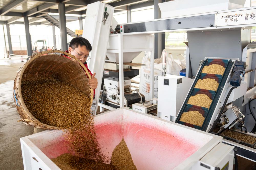 17일 후난(湖南)성 창사(長沙)시 왕청(望城)구의 한 스마트 농장에서 벼 육묘 라인 작업자가 종자를 투입하고 있다.