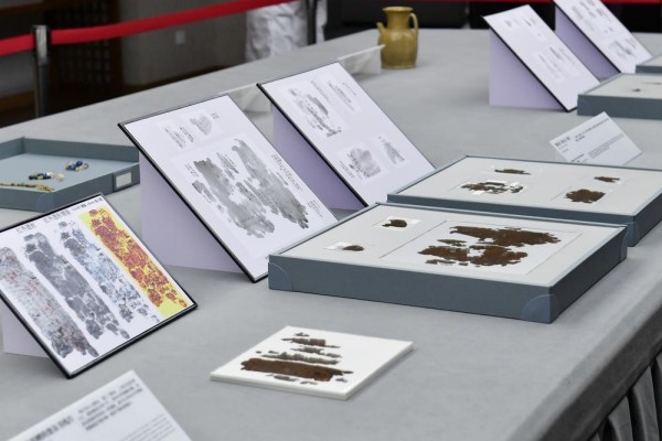 (중국 창사=신화통신) 13일 후난(湖南)성박물관에 전시된 자탄고(子彈庫) 출토 백서(帛書, 비단에 쓴 글).