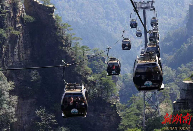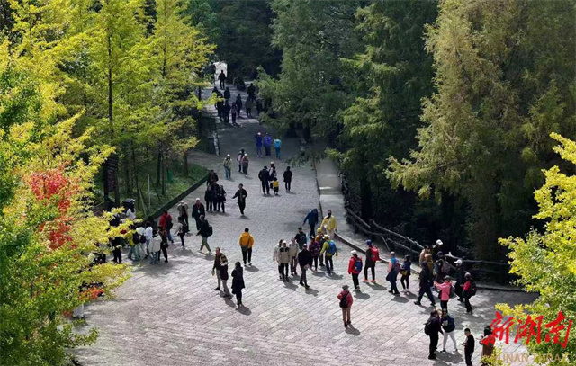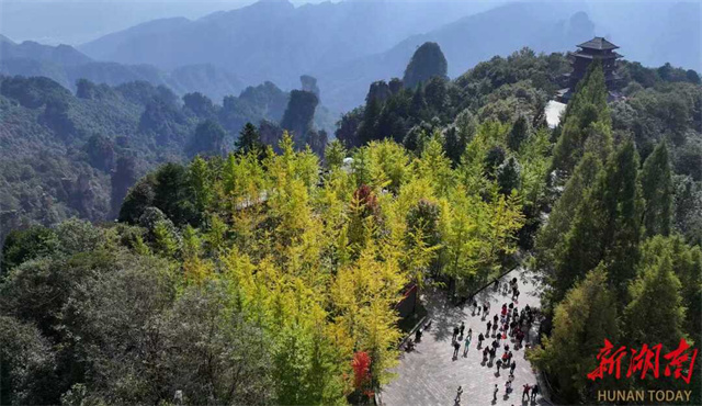 깊어가는 가을, 장자제 국가삼림공원 천자산 관광지에는 오색 단풍이 물들어 가을 풍경이 한 폭의 그림처럼 펼쳐지고 있다. 각지에서 온 관광객들이 이곳을 찾아들며 가을의 아름다운 시간을 즐기고 있다. 현지 문화·관광 부문은 절기 문화와 생태 치유를 중심으로 가을 여행의 새로운 즐길 거리와 체험을 홍보하여, 국내외 관광객들에게 특별한 가을 여행 가이드를 선보이고, 관광 체험을 지속적으로 향상시키고 있다. 10월 23일, 여행객들이 천자산 관광지를 둘러보고 있다. 사진:우융빙(吴勇兵)