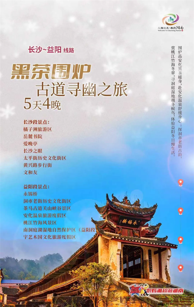안화 흑차 즐기기, 온천 힐링, 둥스 옛 거리 산책, 타오장 대나무 바다 겨울 풍경 감상, 둥팅호 월동 철새 탐방, 이양 겨울 슬로 라이프 체험하기.