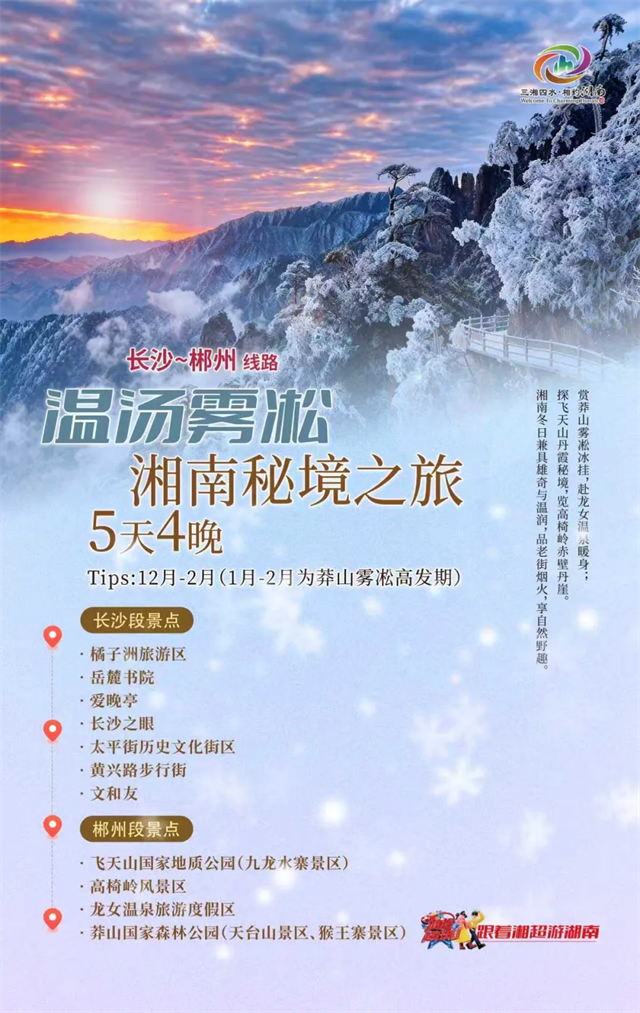 후난성 문화관광청은 겨울철을 맞아 5일 4박 일정의 프리미엄 여행 코스 4가지를 정성껏 기획해, 색다른 겨울의 낭만을 선사했다.
