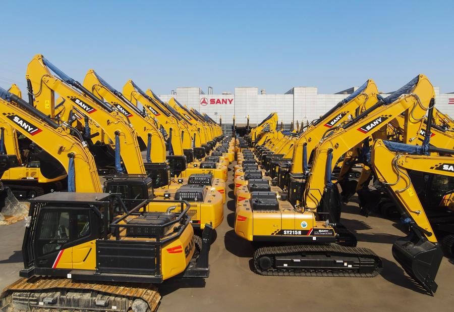 지난해 4월 15일 상하이 싼이(三一)중장비회사에서 발송 대기 중인 굴착기 제품. (사진/신화통신)