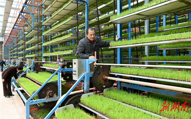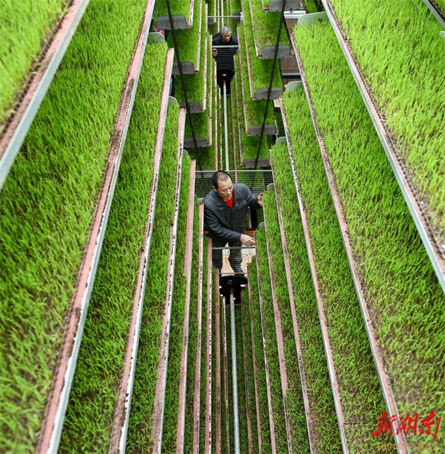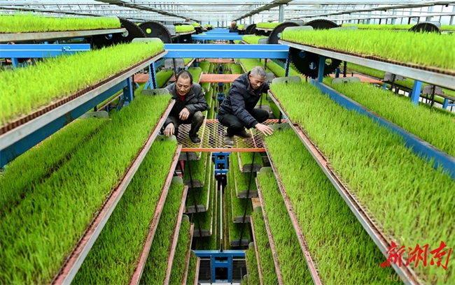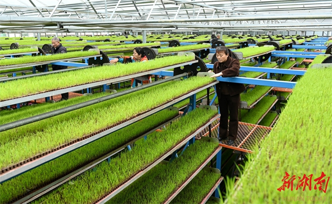 최근 둥커우(洞口)현 가오샤(高沙)진 난미 지능형 육묘 공장에서 직원들이 벼 묘의 생육 상황을 살펴보고 있다. 벼 육묘 철을 맞아 현지에서는 지능형 육묘 공장을 통해 조기 벼 집중 육묘를 진행하여 묘 품질과 기계화 작업 수준을 효과적으로 향상시키고 있다. 사진 텅즈중(滕治中)