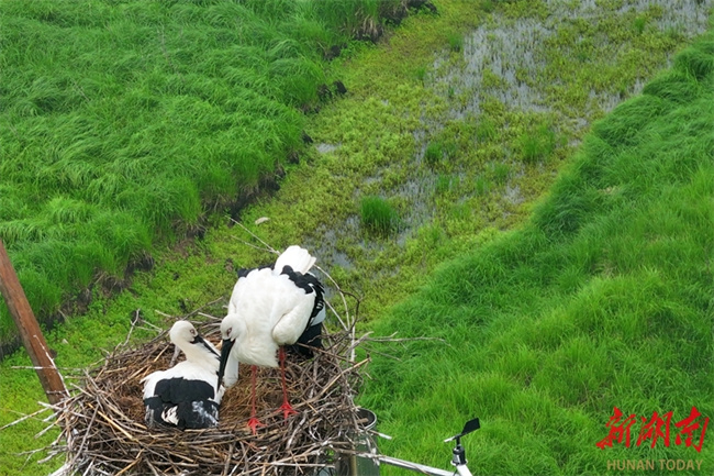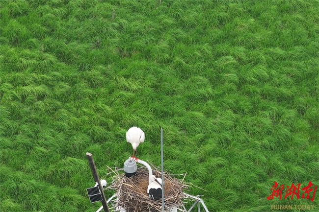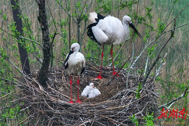 3월 25일, 난현(南县) 남동정호(南洞庭湖) 두촨저우(舵杆洲) 수역에서 한 쌍의 동방백로가 둥지 속 새끼를 보호하고 있다. '조류계 판다'라 불리는 동방백로가 3년 연속 이곳에 정착하여 번식하고 있으며, 모니터링 결과 개체 수가 40마리를 넘어선 것으로 나타났다. 현지에서는 입체적인 순찰과 체계적인 생태 관리에 의존하여, 습지 서식 환경을 지속적으로 최적화하고, 장강 대보호(长江大保护) 및 인간과 자연의 조화로운 공존을 촉진하고 있다. 사진 자오츠(赵持)