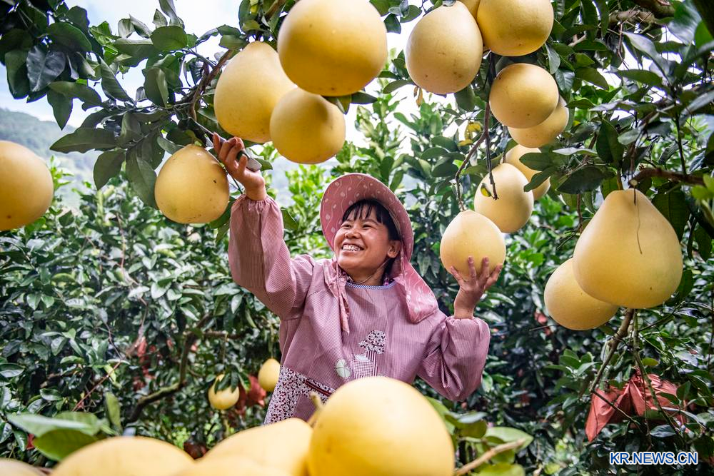 15일 윈난(雲南)성 원산(文山) 좡(壯)족먀오(苗)족자치주의 한 농가에서 유자를 수확하고 있다. 2025.10.15