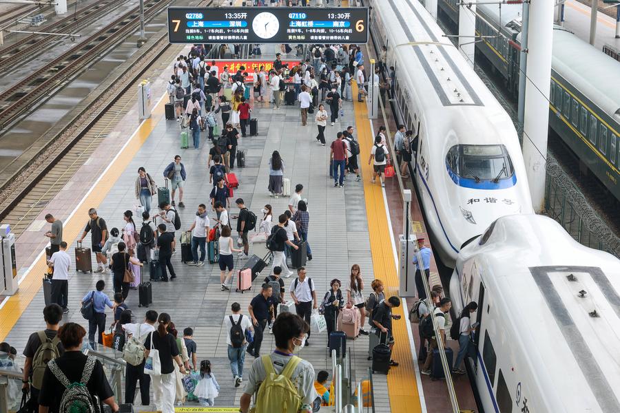 지난 9월 30일 장쑤(江蘇)성 우시(無錫)역에서 열차에 탑승하고 있는 여행객들. (사진/신화통신)
