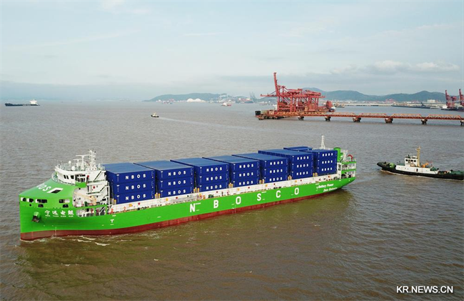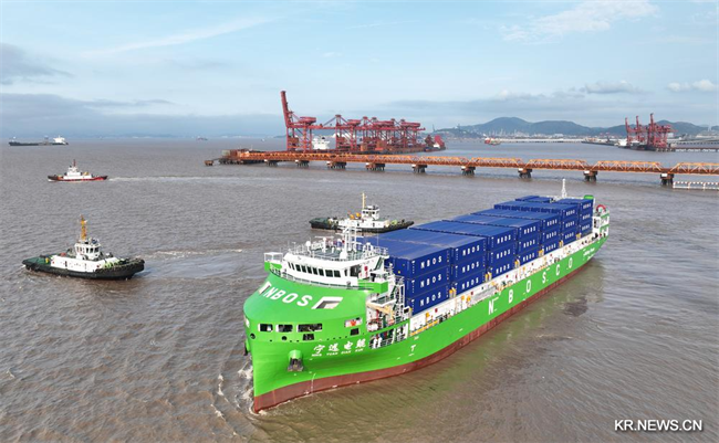 15일 '닝위안뎬쿤(寧遠電鯤)' 컨테이너선이 저장(浙江)성 닝보(寧波)저우산(舟山)항 베이룬(北崙)항구구역에서 출항해 자싱(嘉興)항 자푸(乍浦)항구구역으로 향하는 모습을 드론으로 담았다.