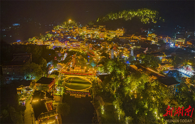 9월 22일 밤, 융순(永顺)현 부용진(芙蓉镇) 관광지는 찬란한 불빛 속에서 폭포와 고건축물이 서로 어우러지며 더욱 빛났다.