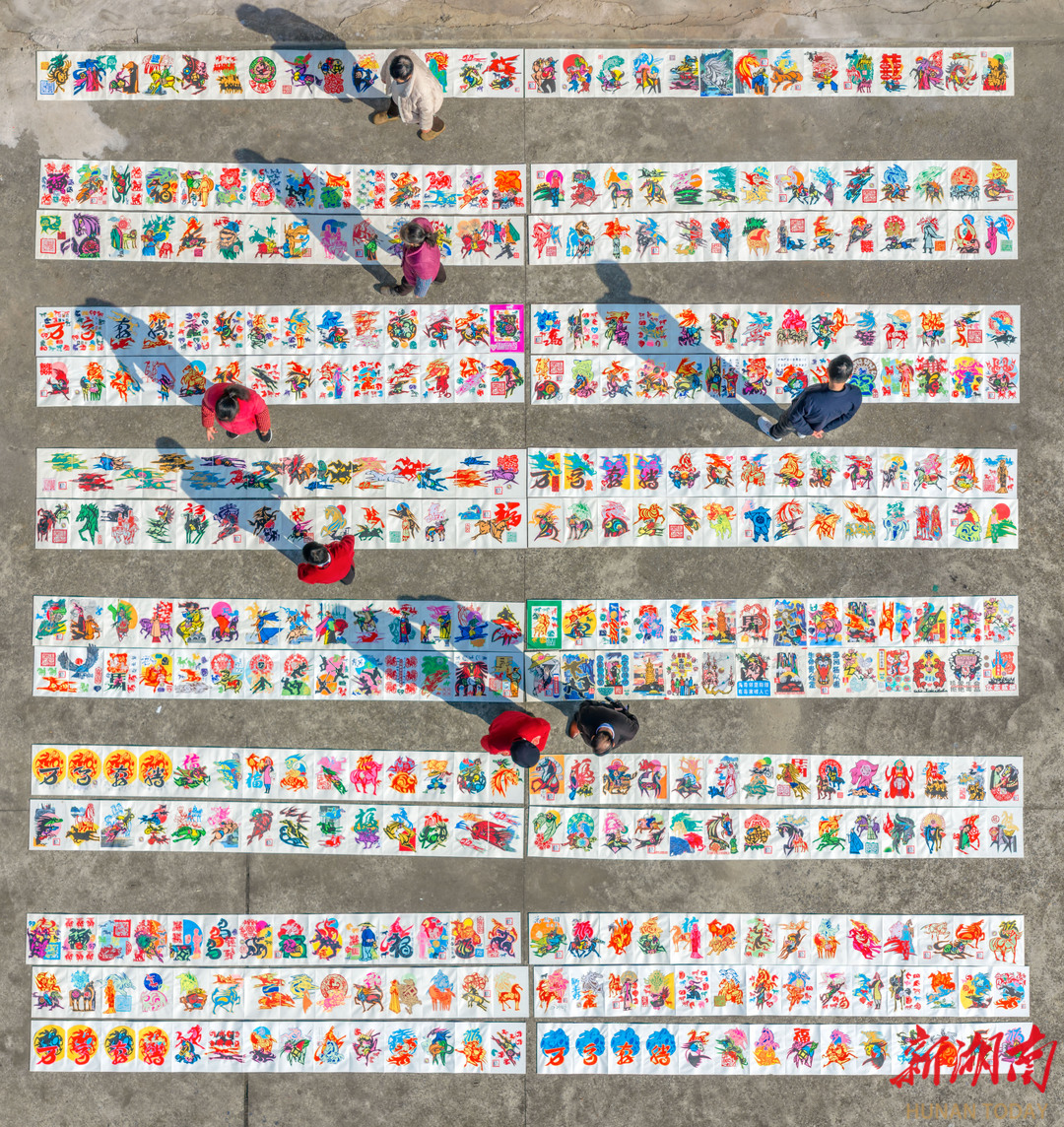 예술 애호가들이 연일 동안현(东安县) 단차이푸진(端桥铺镇) 스바춘(石坝村) 송병전(宋兵前) 종이공예 작업실에 모여 컬러 종이공예 작품 〈만마분등〉을 관람하고 인증 사진을 남겼다.