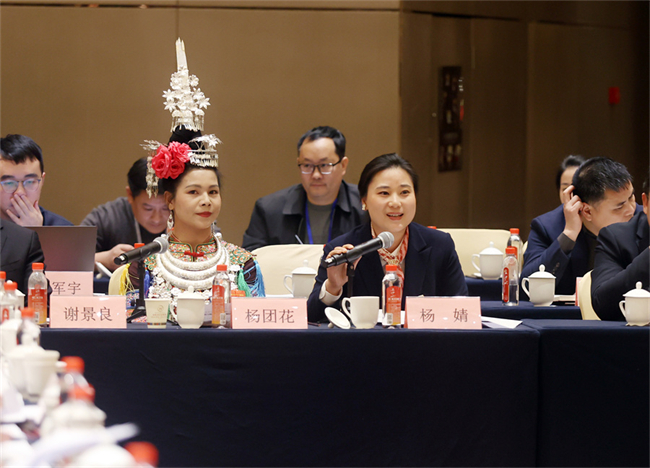 화이화시(怀化市) 대표단의 양징(杨婧) 대표가 영업환경 개선과 후난 제품의 해외 시장 진출 지원에 관한 제안을 제시했다. 사진: 자오치