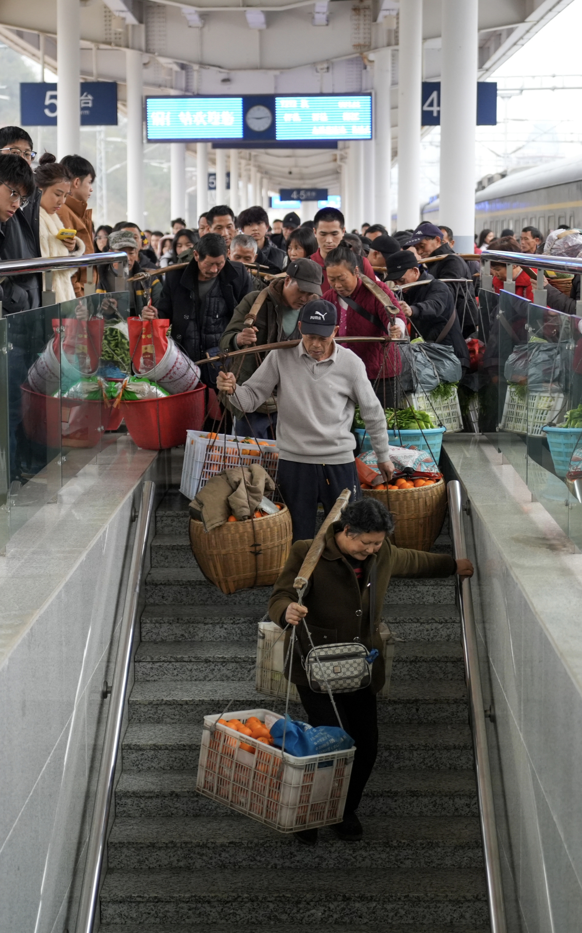 2월 12일, 구이저우성 퉁런시 퉁런역에서 후난성 출신 마을 주민들이 물건을 모두 판매한 뒤 빈 광주리를 메고 7271편열차를 타고 돌아갈 준비를 하고 있다.