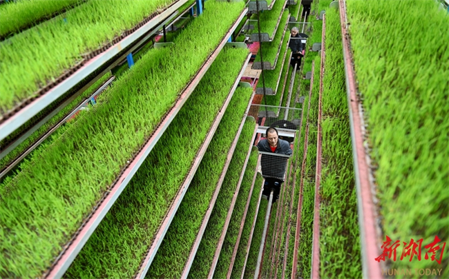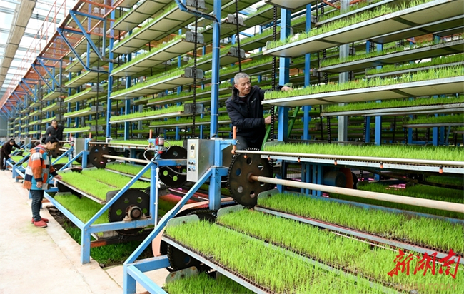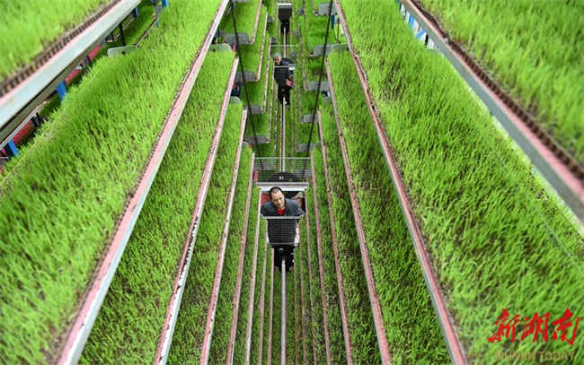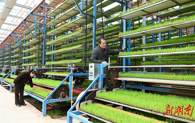최근 둥커우(洞口)현 가오샤(高沙)진 난미 지능형 육묘 공장에서 직원들이 벼 묘의 생육 상황을 살펴보고 있다. 벼 육묘 철을 맞아 현지에서는 지능형 육묘 공장을 통해 조기 벼 집중 육묘를 진행하여 묘 품질과 기계화 작업 수준을 효과적으로 향상시키고 있다. 사진 텅즈중(滕治中)