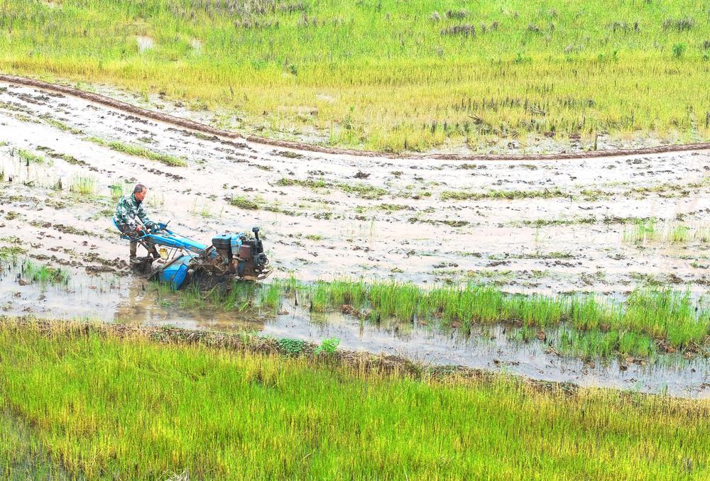 (베이징=신화통신) 7일 후난(湖南)성 헝양(衡陽)시 헝둥(衡東)현에서 농기계로 논갈이를 하는 농민을 드론에 담았다.