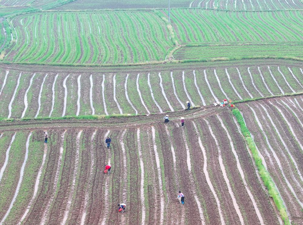 7일 후난(湖南)성 헝양(衡陽)시 헝둥(衡東)현 농경지에서 분주하게 작업 중인 농민들을 드론으로 내려다봤다. 2026.4.7